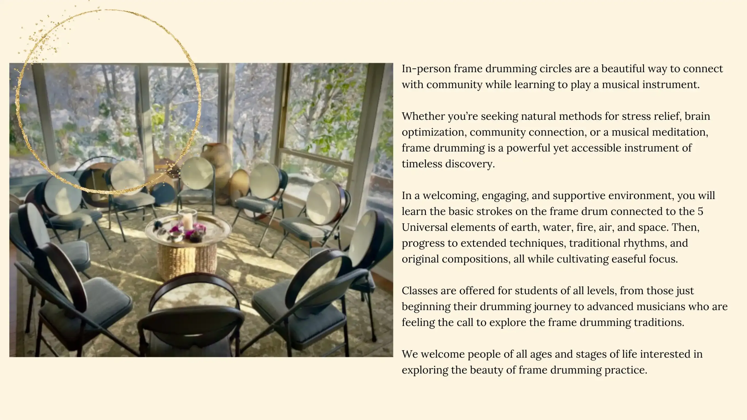 The Frame Drum Academy welcomes people from all ages, stages, learning styles, and walks of life who are interested in learning to play the frame drum.